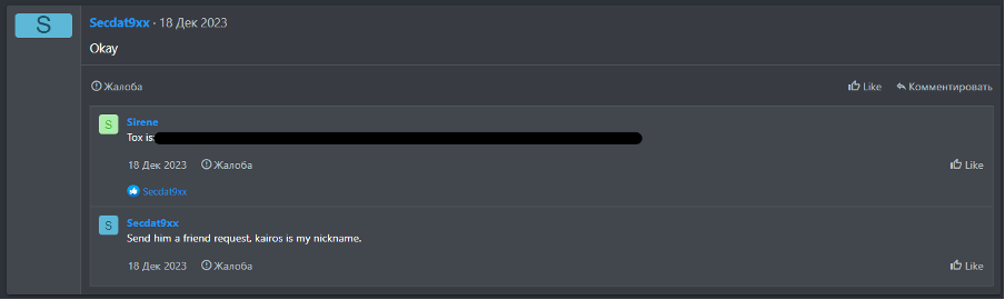 According to Cyjax, Kairos started a bid on an IAB (initial access broker) listing for a Canadian construction company, but didn’t seem to actually follow through on the bid as the listing was reposted. While they never finished their purchase attempt, having access to an IAB would increase the scope in which Kairos could operate. Cyjax also found an interaction in another Russian-language cybercriminal forum in which a user “Secdat9xx” indicates that Kairos is another handle they use on Tox.