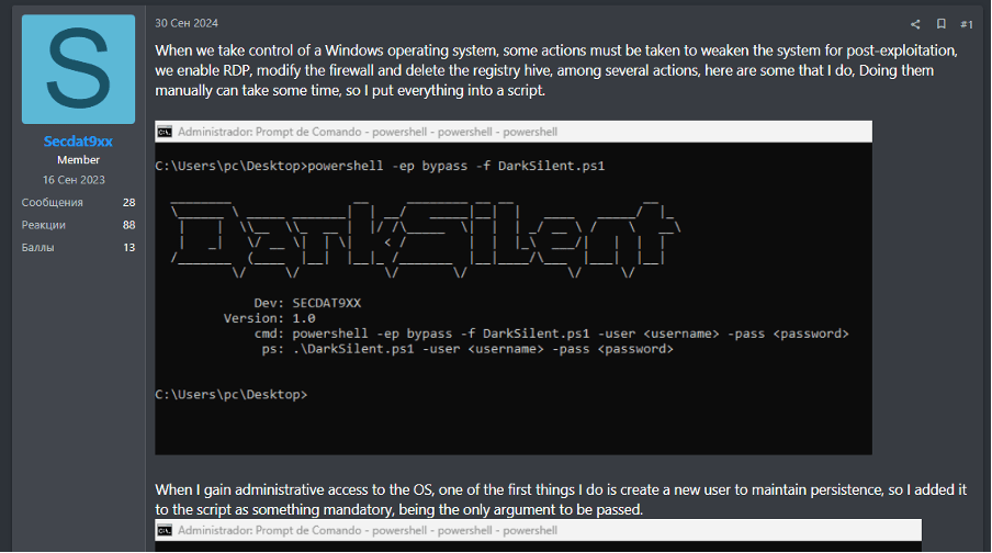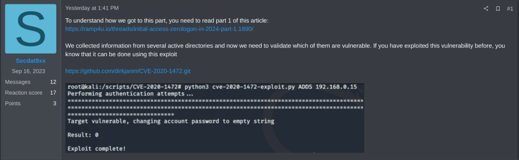 The same user posted 2 guides on RAMP, another Russian speaking cybercrime forum. One of these guides gave details regarding the use of a post-explotation script called “DarkSilent” to help obfuscate persistence, and another discussing a method to utilize ZeroLogOn (CVE-2020-1472) to scan and access vulnerable active directory servers.